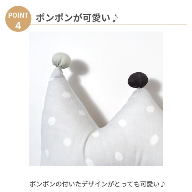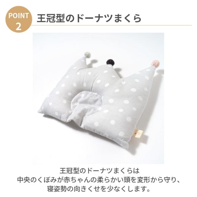 【特徴】王冠型のドーナツまくらは 中央のくぼみが赤ちゃんの柔らかい頭を変形から守り、寝姿勢の向きくせを少なくします。