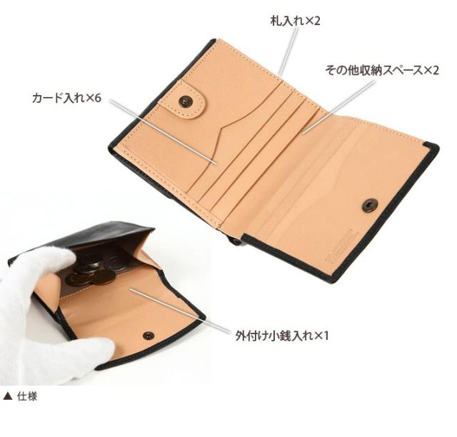 | 仕様 | 札入れ×2、外付け小銭入れ×1、カード入れ×6、その他収納スペース×2 |