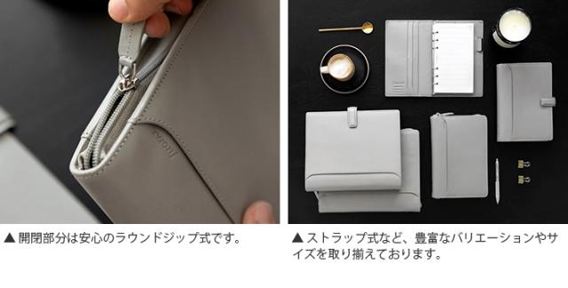 | 仕様 | 見開き左:カードポケット×4、スリップポケット 見開き右:スリップポケット、伸縮性ペンホルダー 外側:ジップポケット、スリップポケット ※画像にございますリング金具のブランド刻印については、仕様の変更により現在は刻印がございません。 |