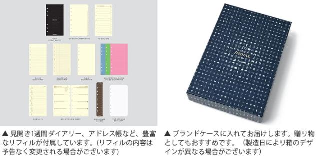 | セット内容 | 年号無し年間スケジュール、定規/ページマーカー、To Doリスト、アドレス帳、インデックス、メモ用紙 ※セット内容はリストや商品画像と異なることがあります。 ※市販のリフィルもご利用頂けます。 |