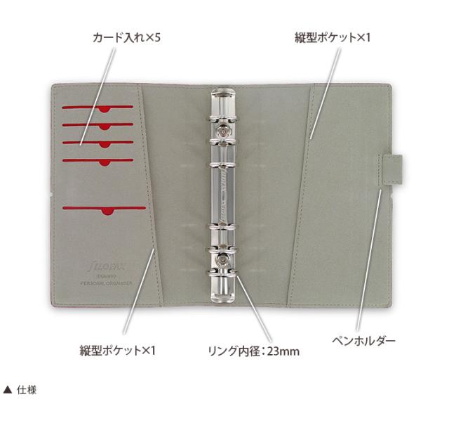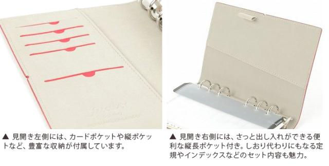 | 仕様 | 見開き左:カードポケット×5、縦型スリップポケット 見開き右:縦型スリップポケット、伸縮性ペンホルダー |