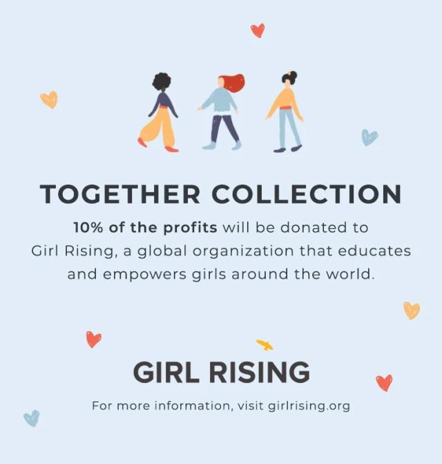 Together Collectionの購入による利益の10%は、世界中の女の子に教育と力を与える世界的な非営利団体Girl Risingに寄付される予定です。