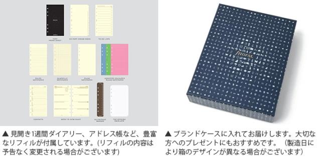 | セット内容 | 年号無し年間スケジュール、定規/ページ マーカー、To Doリスト、アドレス帳、インデックス、メモ用紙 ※セット内容はリストや商品画像と異なることがあります。 ※市販のリフィルもご利用頂けます。 |