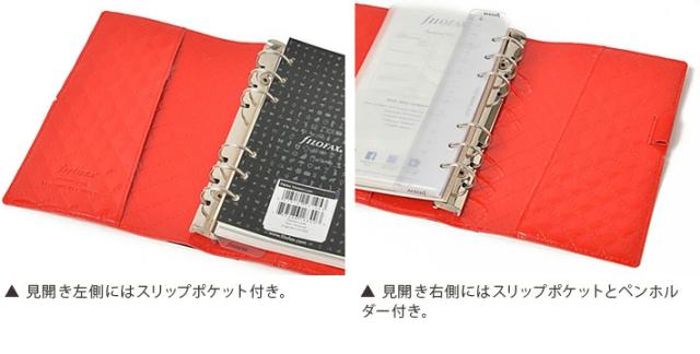 見開き左:スリップポケット 見開き右:スリップポケット、伸縮性ペンホルダー |