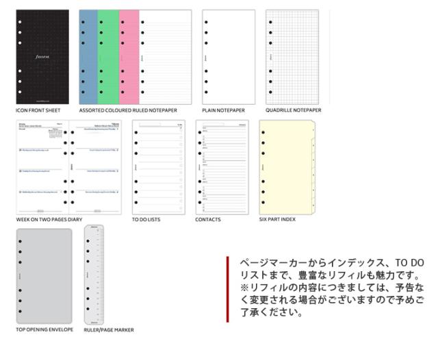 年号無し年間スケジュール、6タブインデックス(クリーム)、つや消し定規/ページマーカー、To Doリスト4枚、罫線メモ用紙(白)8枚、方眼メモ用紙(白)8枚、無地メモ用紙(白)8枚、罫線メモ用紙(ブルー)8枚、罫線メモ用紙(グリーン)8枚、罫線メモ用紙(ピンク)8枚、アドレス帳8枚、上開き封筒 ※セット内容はリストや商品画像と異なることがあります。 ※市販のリフィルもご利用頂けます。 |