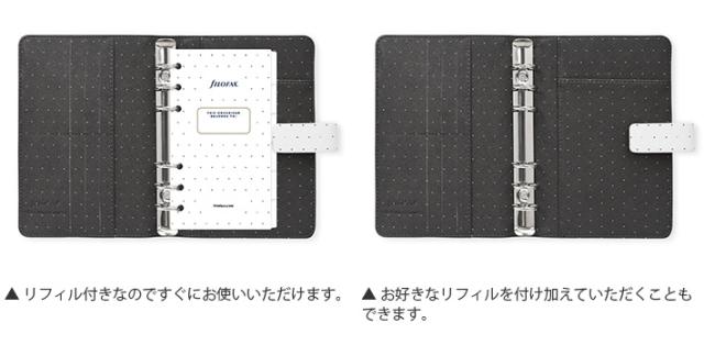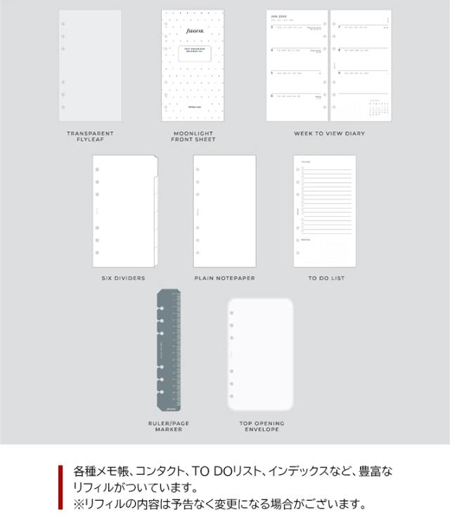 | セット内容 | 透明フライリーフ、ムーンライト表紙、年号無し年間スケジュール、インデックス(白)6枚、To Doリスト10枚、無地メモ用紙10枚、定規/ページマーカー(グレー)、上開き封筒 ※セット内容はリストや商品画像と異なることがあります。 ※市販のリフィルもご利用頂けます。 |