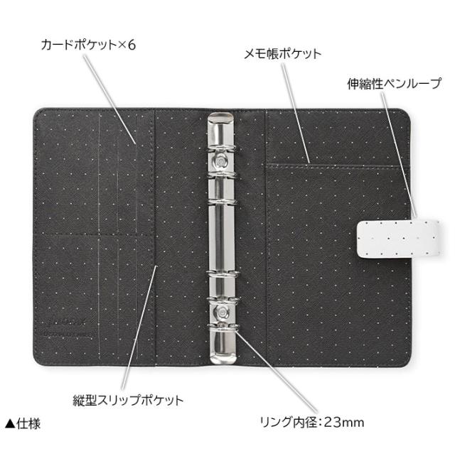 | 仕様 | 見開き左:カードポケット×6、縦型スリップポケット 見開き右:メモ帳ポケット、伸縮性ペンループ |
