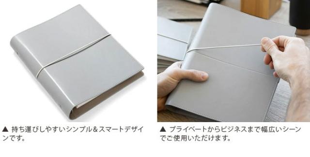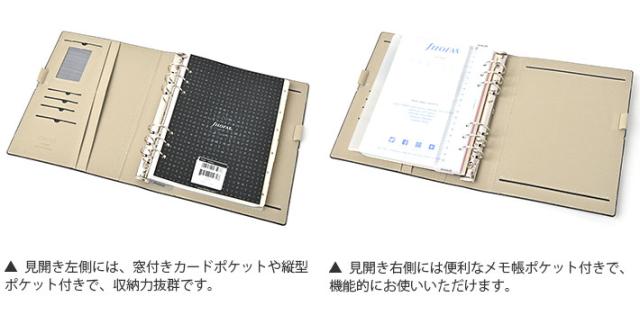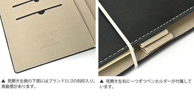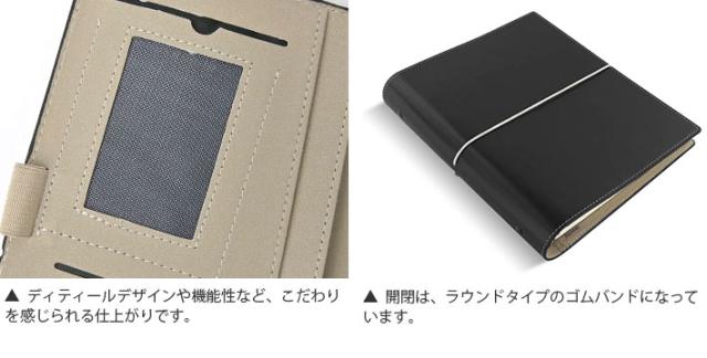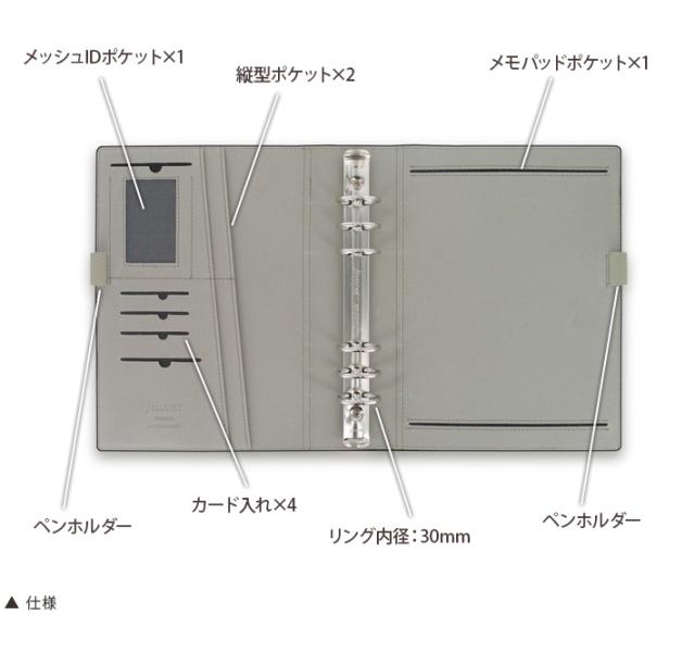 | 仕様 | 見開き左:カードポケット×4、縦型スリップポケット×3、伸縮性ペンホルダー、ウィンドウポケット 見開き右:伸縮性ペンホルダー、メモ帳ポケット |