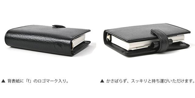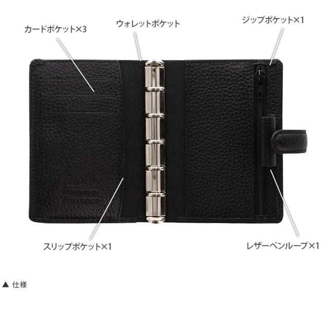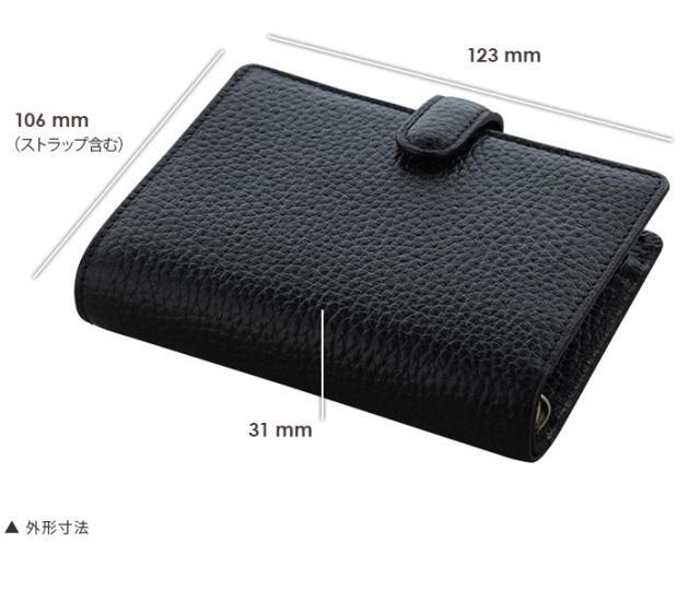 | 仕様 | 見開き左:カードポケット×3、スリップポケット 見開き右:ジップポケット、レザーペンループ 背面:ウォレットポケット |