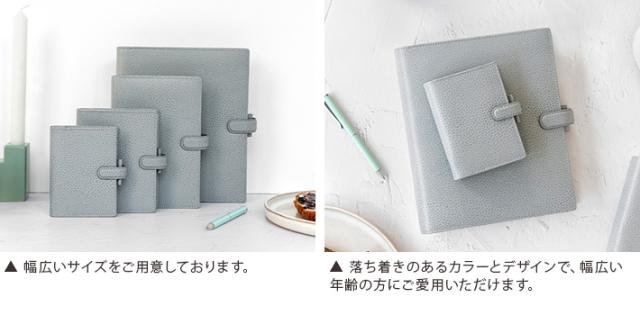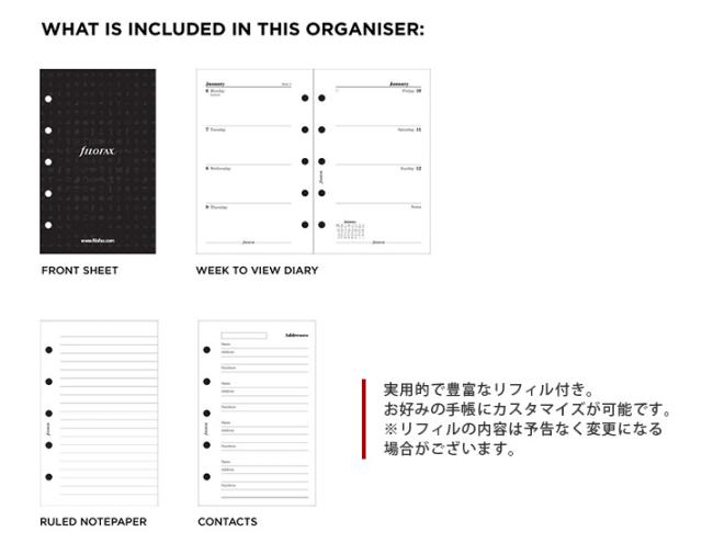 | セット内容 | 表紙、年号無し年間スケジュール、インデックス、アドレス帳、罫線メモ用紙 ※セット内容はリストや商品画像と異なることがあります。 ※市販のリフィルもご利用頂けます。 |