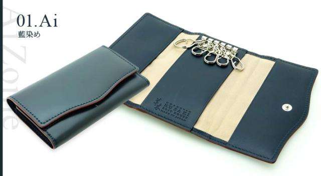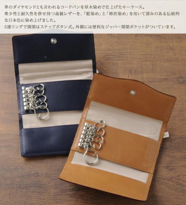 | 商品説明 | 革のダイヤモンドとも言われるコードバンを草木染めで仕上げたキーケース。 希少性と耐久性を併せ持つ高級レザーを、「藍染め」と「柿渋染め」を用いて深みのある伝統的な日本色に染め上げました。 5連リングで開閉はスナップボタン式。外側には便利なジッパー開閉ポケットがついています。 |