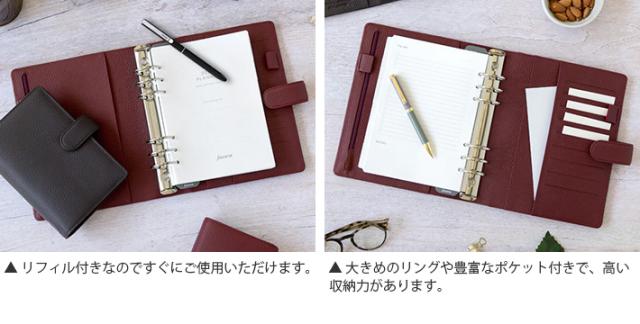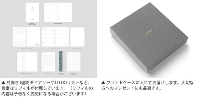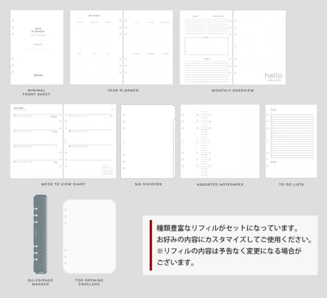 | セット内容 | 表紙、年号無し年間スケジュール、年間予定表、マンスリーオーバービュー、インデックス、To Doリスト、各種メモ用紙、定規/ページマーカー、上開き封筒 ※セット内容はリストや商品画像と異なることがあります。 ※市販のリフィルもご利用頂けます。 |