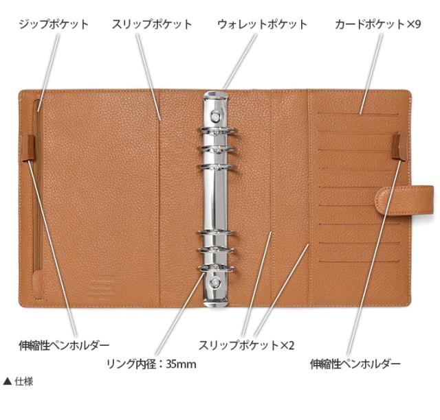 | 仕様 | 見開き左:ジップポケット、スリップポケット、伸縮性ペンホルダー 見開き右:カードポケット×9、スリップポケット×2、伸縮性ペンホルダー 背面:ウォレットポケット |