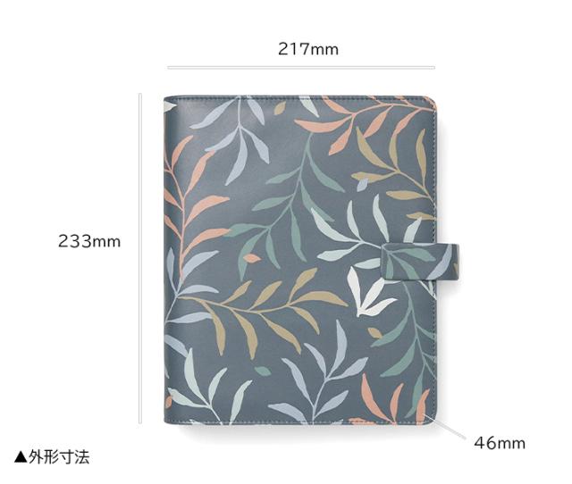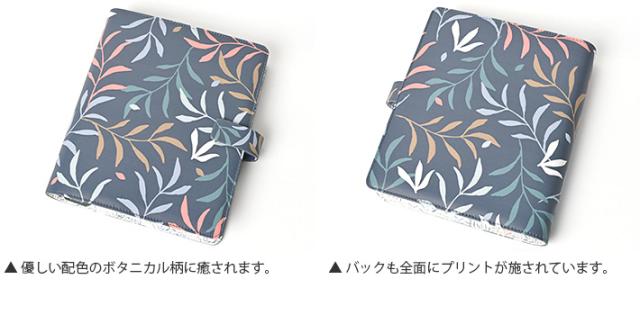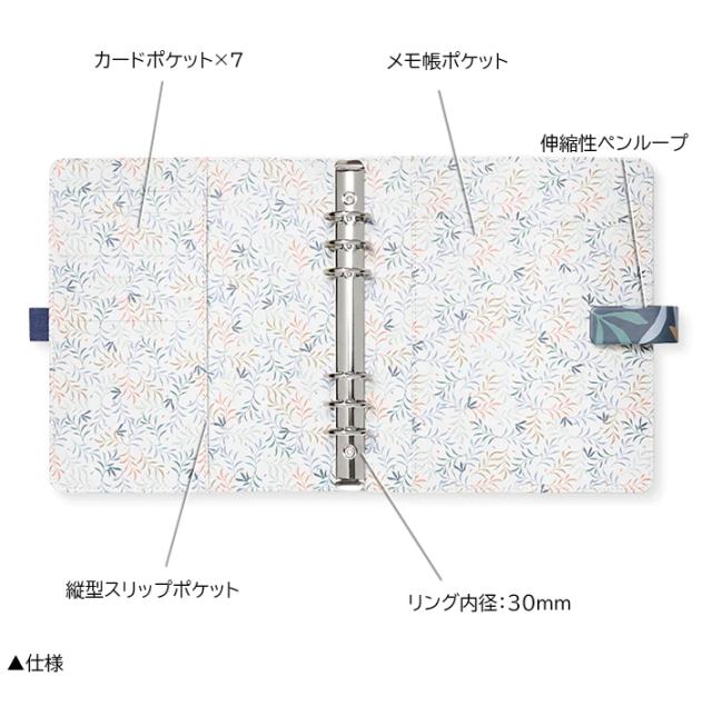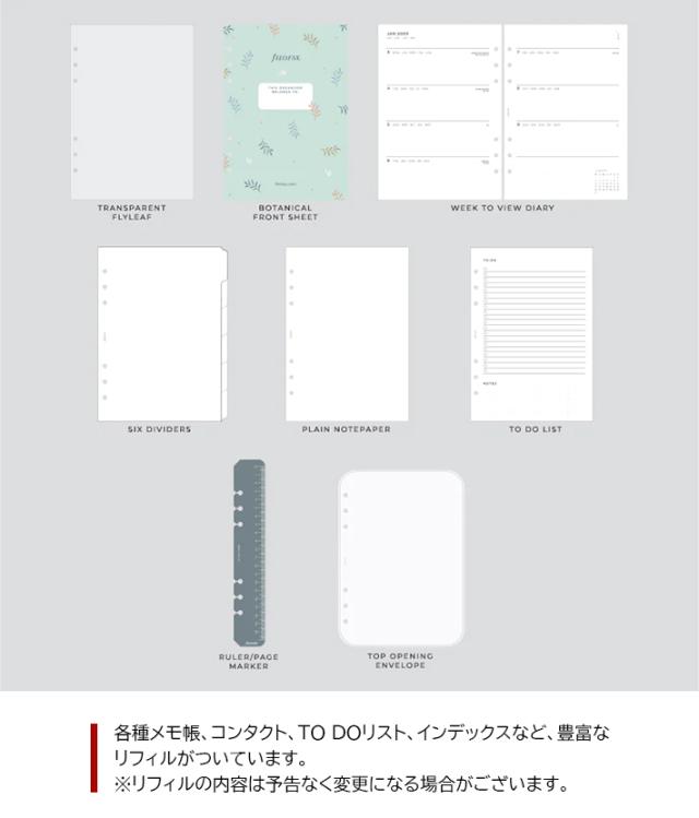 | セット内容 | 透明フライリーフ、ボタニカル表紙、年号無し年間スケジュール、インデックス(白)6枚、To Doリスト10枚、無地メモ用紙10枚、定規/ページマーカー(グレー)、上開き封筒 ※セット内容はリストや商品画像と異なることがあります。 ※市販のリフィルもご利用頂けます。 |