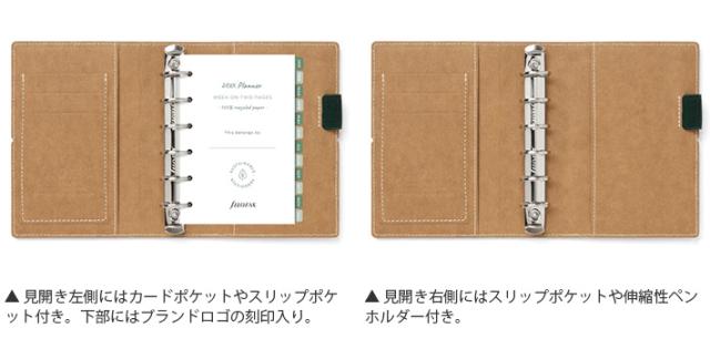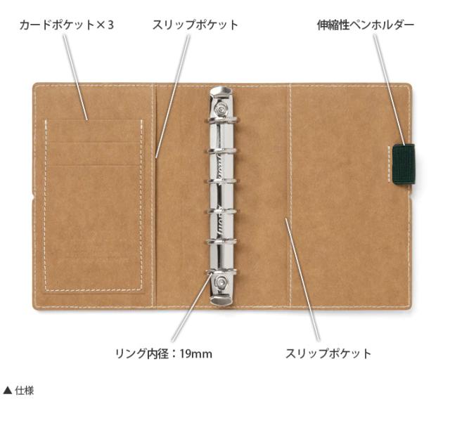 | 仕様 | 見開き左:カードポケット×3、スリップポケット 見開き右:スリップポケット、伸縮性ペンホルダー |