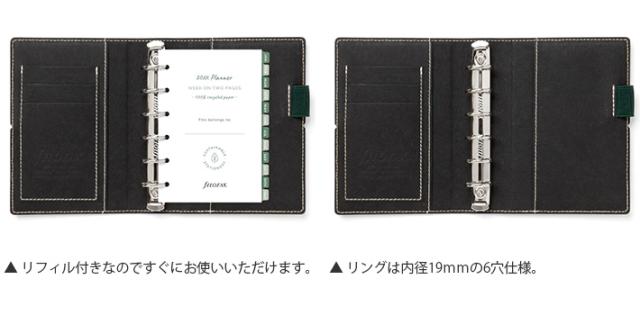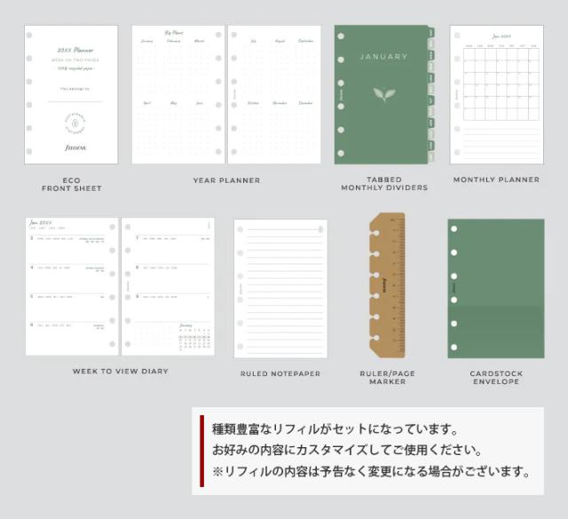 | セット内容 | エコ表紙、年号無し年間スケジュール、タブ付きマンスリーインデックス、年間予定表、月間予定表、罫線メモ用紙、定規/ページマーカー、カードストック封筒 ※セット内容はリストや商品画像と異なることがあります。 ※市販のリフィルもご利用頂けます。 |
