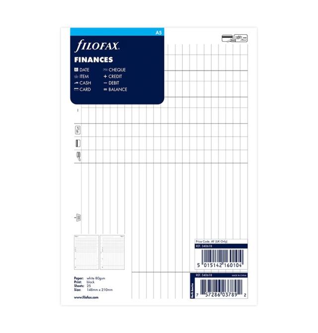 A5サイズのシステム手帳やクリップブック用の便利なリフィルで、家計簿を付けましょう。25枚入り。