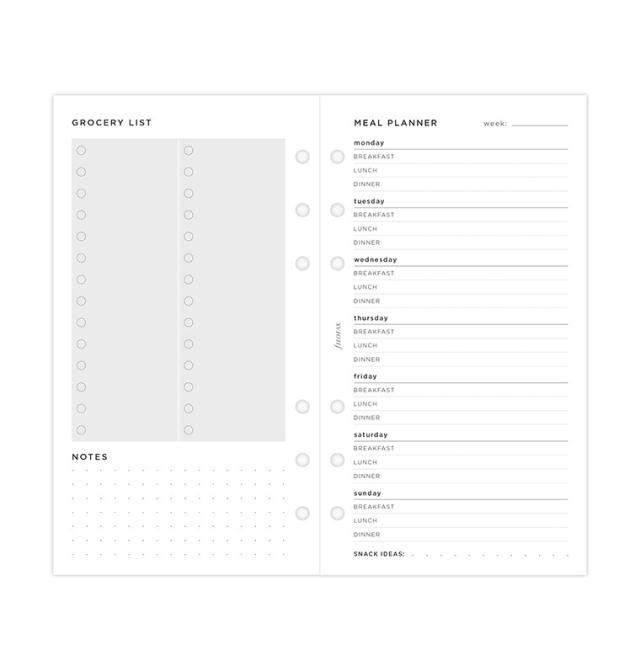 バイブルサイズのシステム手帳やクリップブック用のミールプランナーリフィルを使って、おいしいレシピを計画し、食料品の予算を守りましょう。56枚入り。