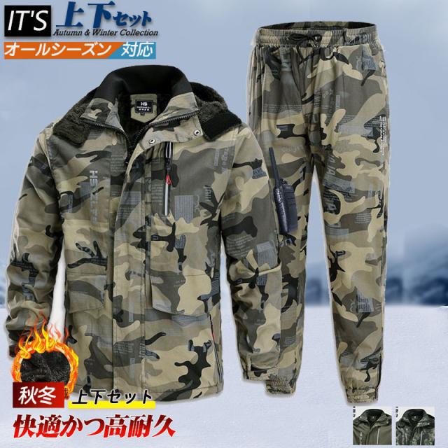 作業服 上下セット メンズ マウンテンジャケット ワークパンツ ミリタリージャケット 防寒 防風 厚手 裏起毛 裏ボア マウンテンパーカー 長ズボン