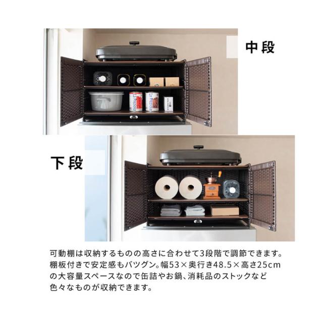 幅55×奥行き51×高さ35cmの広々としたサイズで、ホットプレートもラクラク収納。キッチンの使い勝手を向上させます。