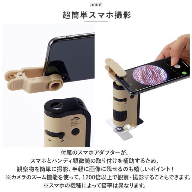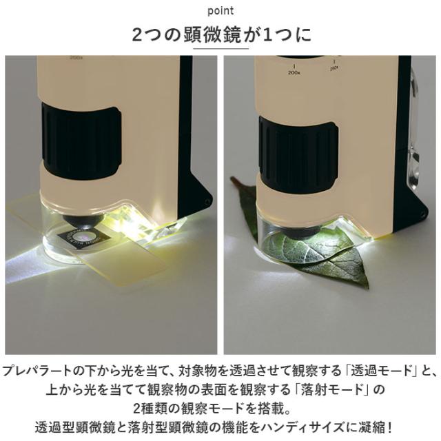 | 商品説明 | ・いつでもどこでも、ミクロの世界にズームイン!スマホ撮影だって手軽にできる「ハンディ顕微鏡 DX(倍率100〜250倍)」が新登場。 【2つの顕微鏡が1つに】 ・プレパラートの下から光を当て、対象物を透過させて観察する「透過モード」と、上から光を当てて観察物の表面を観察する「落射モード」の2種類の観察モードを搭載。透過型顕微鏡と落射型顕微鏡の機能をハンディサイズに凝縮! 【ワンタッチモード切り替え】 ・透過ライトパネルを回転させるだけで、「透過モード」と「落射モード」の切り替えがワンタッチ。(※LEDライトも自動で切り替わります。) 【よく見えるヒミツは“光の収束”】 ・透明ライトパネルのアクリルの溝や断面に光が集まる特性を利用し、観察物の下から十分な光の照射が可能に。 【クイックズーム機能】 ・ズームレバーが100倍/150倍/200倍/250倍の位置でカチッと止まり、的確な倍率の切り替えでスムーズな観察をサポート。 【超簡単スマホ撮影】 ・付属のスマホアダプターが、スマホとハンディ顕微鏡の取り付けを補助するため、観察物を簡単に撮影、手軽に画像に残せるのも嬉しいポイント!(※カメラのズーム機能を使って、1200倍以上で観察・撮影することもできます。※スマホの機種によって倍率は異なります。) 【UVライトで光るものを探そう】 ・ハンディ顕微鏡本体左側にLEDライトスイッチ、右側にはUVライトスイッチを配置。UVライト機能で、身近な光るものを見つけてみよう!(※UVライトは、落射モード時のみ点灯します。目を傷める恐れがあるため、LEDライト・UVライトを直接見ないようにしてください。) 【すぐ試せるプレパラート】 ・透過モードですぐに観察ができる付属のプレパラート(玉ねぎの皮)が1枚。オリジナルのプレパラートが作れる「スライドガラス&カバーガラス」も付属。 【便利なハンドストラップ付き】 ・公園やアウトドアに出かけて植物の葉や昆虫などの生物の観察がすぐにスタートできる、持ち運びに便利なハンドストラップ付き。好奇心旺盛なキッズの放課後や、夏休みの自由研究に大活躍! |
