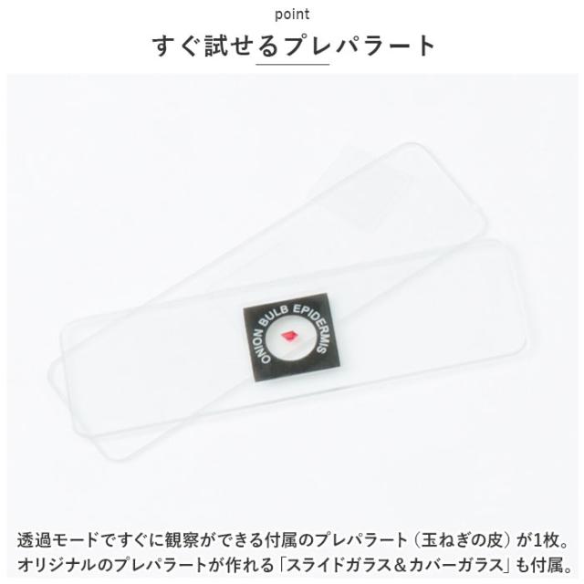 | 素材 | 【本体・スマホアダプター】ABS 【レンズ】アクリル 【レンズカバー・透過ライトパネル】PC 【プレパラート(スライドガラス&カバーガラス)】PC |