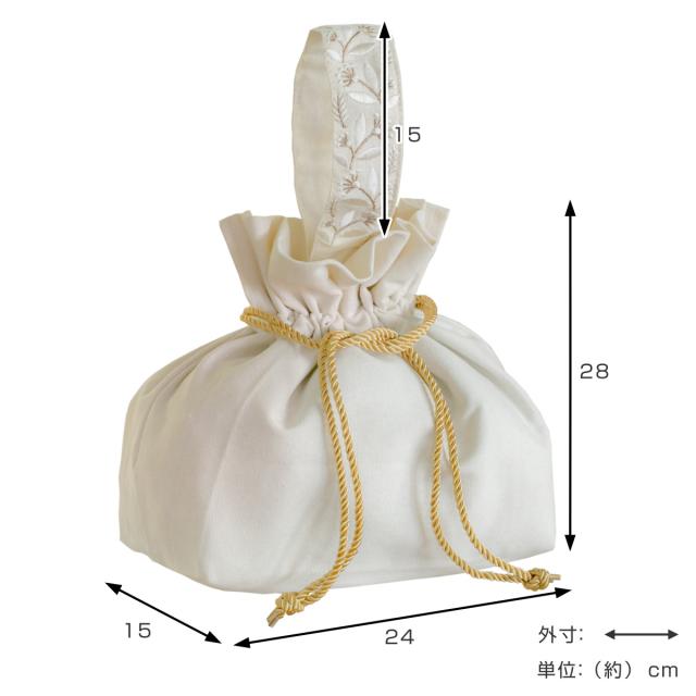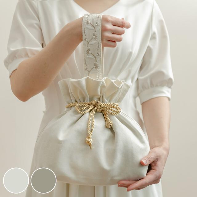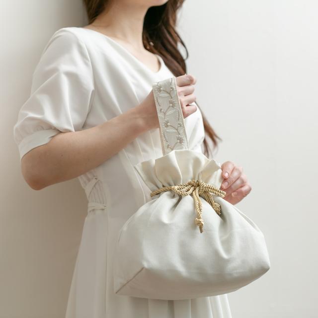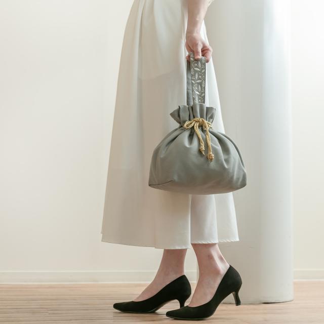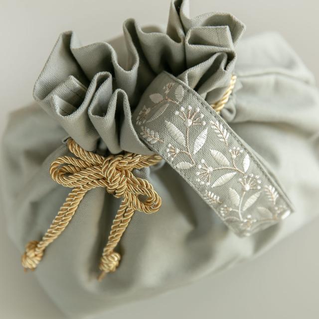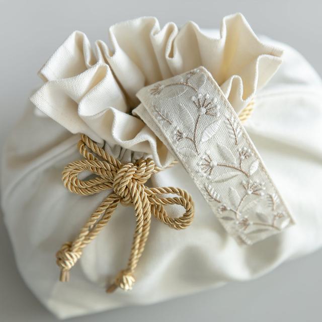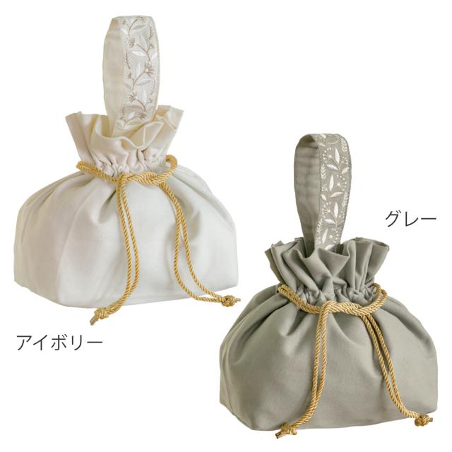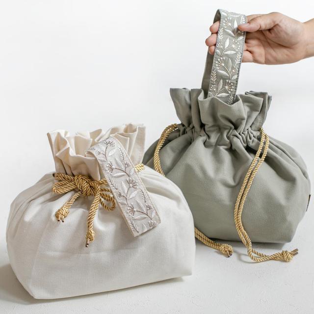 優しい色合いのアイボリーとグレーの2色展開のランチバッグです。金色のヒモが目を惹く華やかなデザインです。