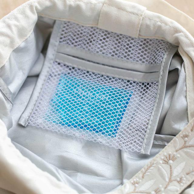 内側に保冷剤を収納できるポケットが備わっているので、衛生面が気になる暖かい季節でも、安心してお弁当が持ち運びできます。中の素材はポリエステルにシルバーコーティングを施し、汚れを拭き取りやすく、衛生的です。