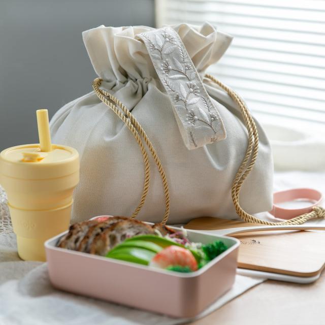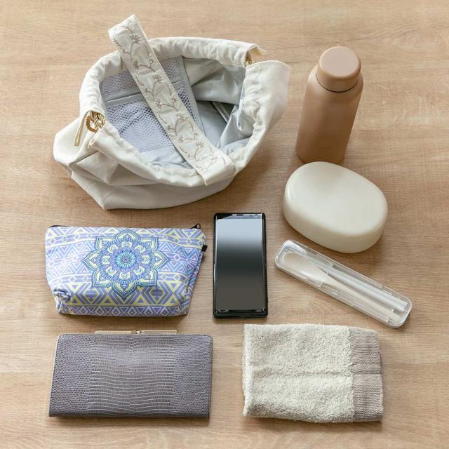 お弁当箱の他に、350mlの水筒や、化粧ポーチや貴重品などもたっぷり入る大きさです。ランチタイムのちょっとした移動で必要なものがしっかり入り、1つにまとめて持てるので、荷物がかさばらず大変便利です。