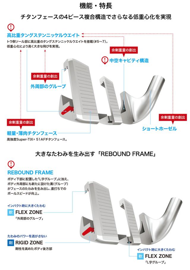 チタンフェースの4ピース複合構造による徹底した低重心設計とアイアン版「REBOUND FRAME」が高く伸びる弾道で