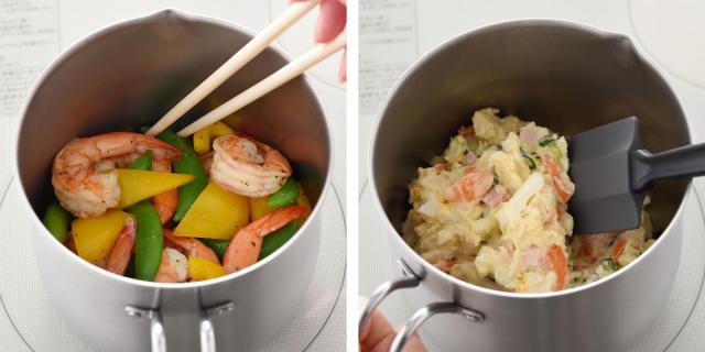 「1.沸かす 2.茹でる 3.煮る 4.炒める 5.揚げる 6.炊く 7.和える 8.保存する 9.蒸す」の9役をこのマルチポット1つでこなせます。