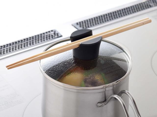 調理中に鍋の中身を確認できるガラス製のふたもついています。また、つまみ部分の溝に菜箸やお玉をちょい置きできるので、料理中も場所を取らず、キッチンがスッキリします。
