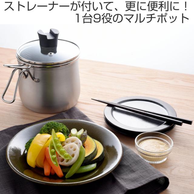 マルチポット 14cm IH対応 ストレーナー付き ガラス蓋付き ステンレス製 日本製 逸品物創 ( ガス火対応 オール熱源対応 鍋 片手鍋 セット 万能鍋 深型 14センチ 2.1L 3点セット 1台9役 ステンレスマルチポット ステンレス 小さめ )