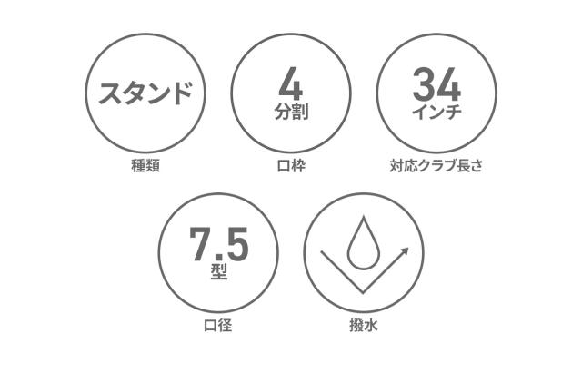 | 仕様 | <外側> フード収納×1 ジップポケット(L)×1 ジップポケット(M)×2 ポケット(S)×1 <内側> ベルクロポケット(L)×1 ジップポケット(S)×1 ポケット(S)×1 <付属品> フード×1 プレート×1 ドライバーカバー×1 フェアウェイウッドカバー×1(番号札×4付き) パターカバー×1 |