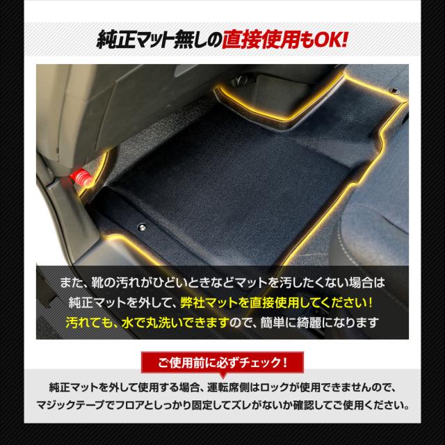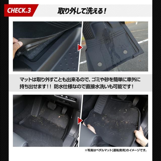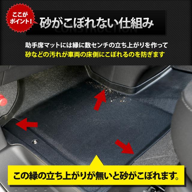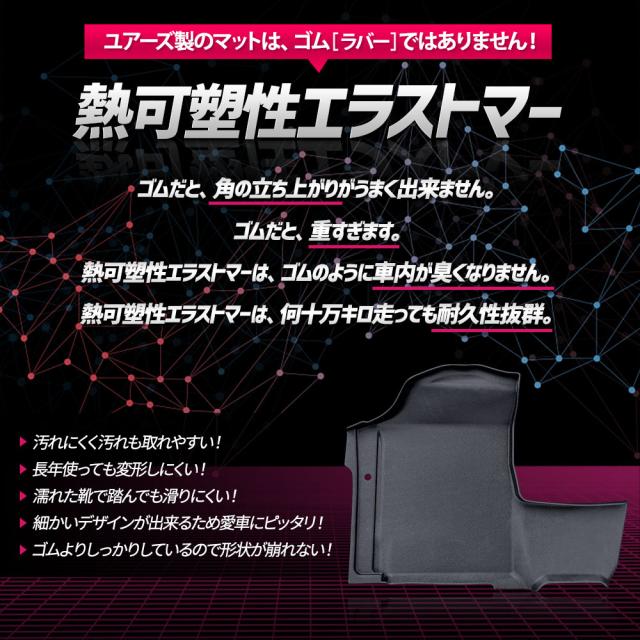 ・フロアをスキャンして製作しているのでピッタリフィット! ・マットの一部には付属のマジックテープで車体と固定するのでマットは全くズレません! ■純正マットの端から落ちるゴミや砂をガッチリガード!! ・隙間なくフィットするので、ゴミや砂が直接車両床に落ちることはありません。 ・3Dデザインなので縁の数センチの立ち上がりで水や汚れをしっかりキャッチ! ■完全防水なのでお手入れも簡単! ・水や汚れは軽いものならウエスなどで拭くだけでOK! ・全面的に汚れた場合は丸洗いも可能なので衛生的です。 ■新素材の熱可塑性エラストマー(TPE)を使用。 ・弾力があり、曲げたりすることも可能なので、お車からの取り外しも容易です。 ・ゴムのように車内が臭くなりません。 ・耐久性抜群なので何十万キロ走っても大丈夫です。 |
