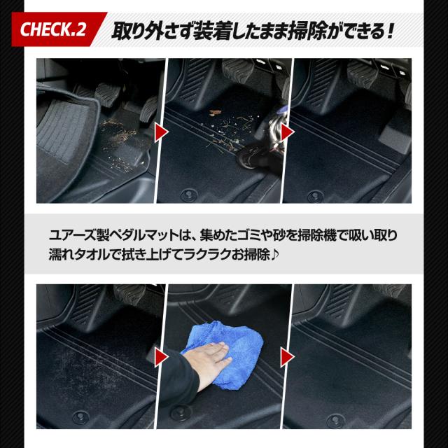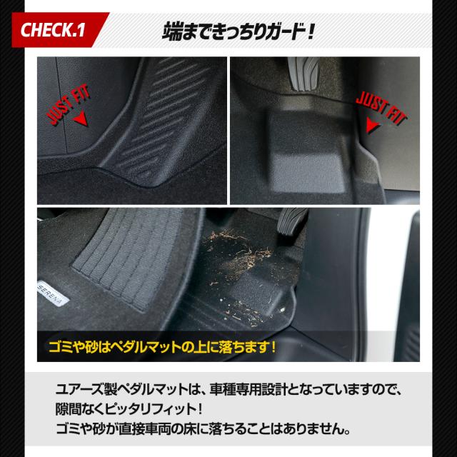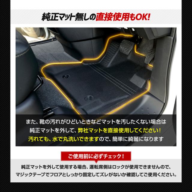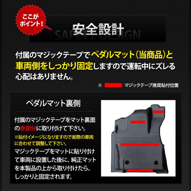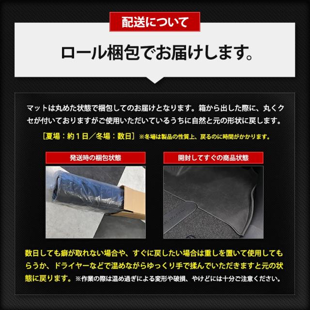 ■元に戻りやすい素材ですので、到着時に型が付いている場合は平らな場所で数日置いてください。 それでも戻らない場合は、ドライヤー温風を当てながら手で反対側に丸めて調整してください。 ■適合車種以外の車両には使用しないで下さい。 ■車両側と純正マットが留具リング(グロメット)などでしっかり固定されているか確認して下さい。 ■本商品と純正マットを固定する付属のマジックテープは必ず推奨位置に貼り付けてご使用下さい。 ■事前にアクセルペダルやブレーキペダル操作を行ない運転操作に支障がないかをご確認の上、ご使用下さい。 |