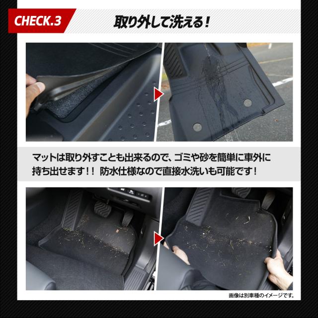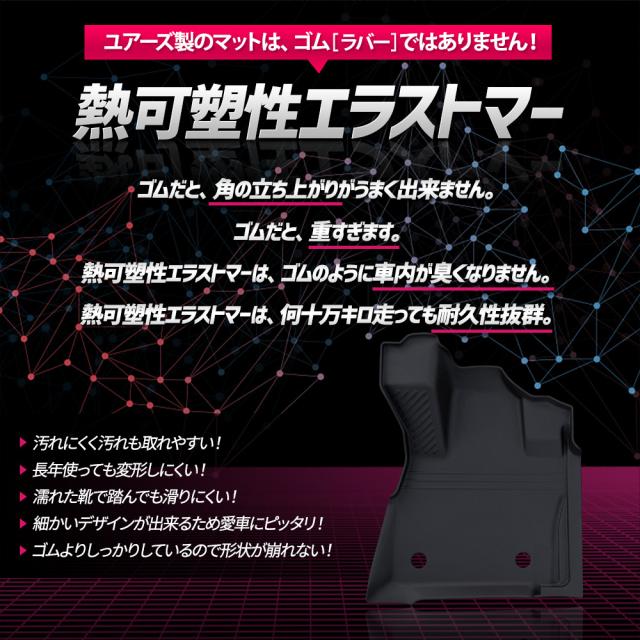 ・フロアをスキャンして製作しているのでピッタリフィット! ・付属のマジックテープで固定するので運転中にマットは全くズレません! ■純正マットの端から落ちるゴミや砂をガッチリガード!! ・隙間なくフィットするので、ゴミや砂が直接車両床に落ちることはありません。 ・3Dデザインなので縁の数センチの立ち上がりで水や汚れをしっかりキャッチ! ■完全防水なのでお手入れも簡単! ・水や汚れは軽いものならウエスなどで拭くだけでOK! ・全面的に汚れた場合は丸洗いも可能なので衛生的です。 ■新素材の熱可塑性エラストマー(TPE)を使用。 ・弾力があり、曲げたりすることも可能なので、お車からの取り外しも容易です。 ・ゴムのように車内が臭くなりません。 ・耐久性抜群なので何十万キロ走っても大丈夫です。 |