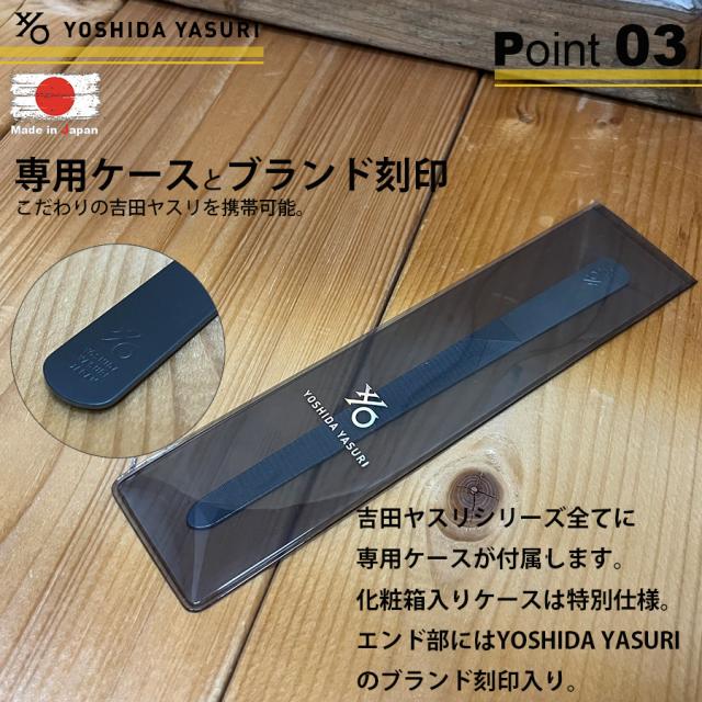 形状2タイプ・カラー2色からお好みの合わせてチョイスが可能。 こちらのヤスリシリーズはプレゼントに最適な化粧箱入り。 中には携行や保管に便利な特別仕様の専用ケースが付属しています。 エンド部にはブランド刻印入り。一生モノのヤスリとして長くご愛用頂けます。 プロのネイリストも愛用の吉田ヤスリを是非!! |