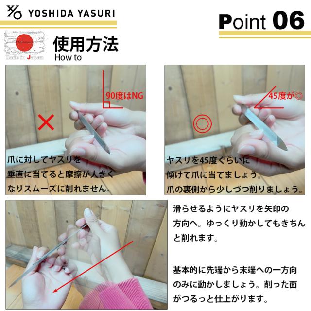 | YOSHIDAYASURI 吉田ヤスリ製作所 創業120年 吉田ヤスリ製作所は江戸時代から続く新潟県燕市の金属加工技術を現在まで受け継ぎ シンプルで使いやすく高品質な爪ヤスリを製造しています。 切らない爪切りとしても認知が高く削ることで爪切り同様の効果が得られます。 繊細な削りが可能なので好みのカタチに整えることが可能。 ネイルをされる方はもちろん。スポーツ・楽器を演奏される方にもオススメです。 |