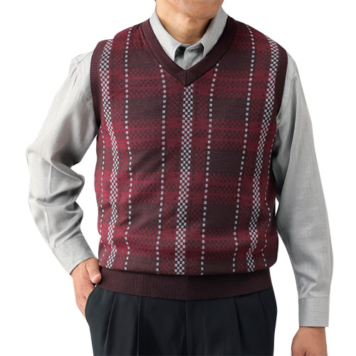 お洒落なダイヤ柄のグレー系、カジュアルな格子柄のネイビー系とワイン系、シャツなどと合わせやすいVネックのベストです。