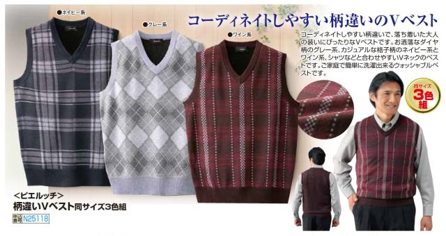 ニットベスト プルオーバー メンズ ピエルッチ 柄違い Vベスト 3色組 紳士服 シニア 男性 ネイビー グレー ワインレッド チェック ダイヤ柄 V首 Vネック チョッキ シンプル トラッド ファッション 50代 60代 70代 80代 父の日 お父さん 秋冬 sai p25118 p27710
