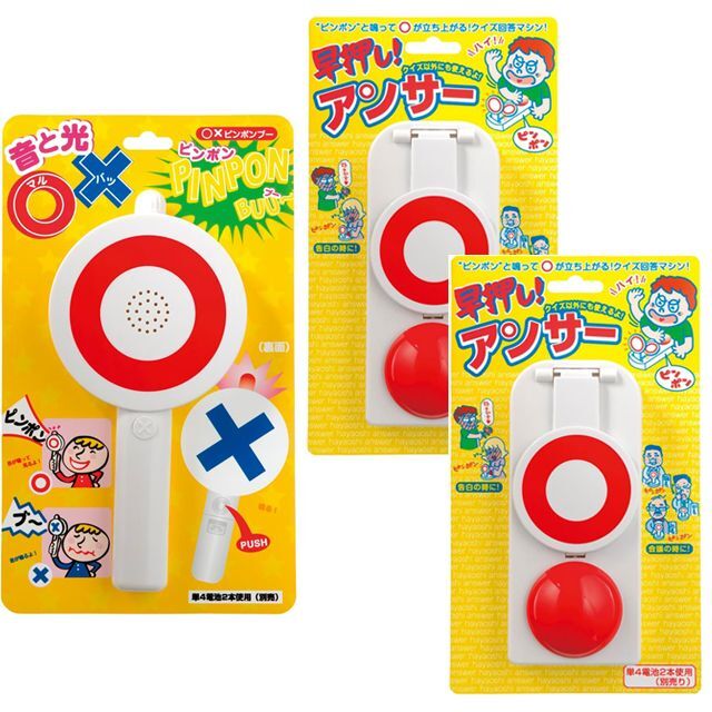 ご家族やご友人と楽しめるように、「〇×ピンポンブー」は1台、早押しアンサーは2台というセットにてお届けいたします。