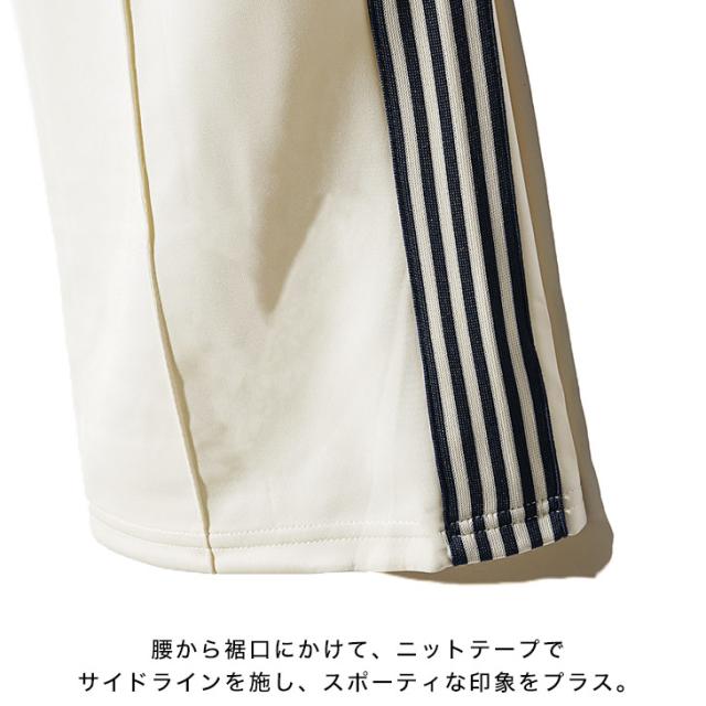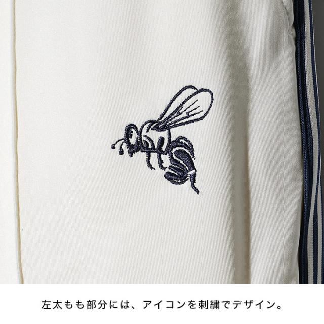 腰から裾口にかけて、ニットテープのサイドラインをデザインし、左太もも部分にはアイコンを刺繍で配置。