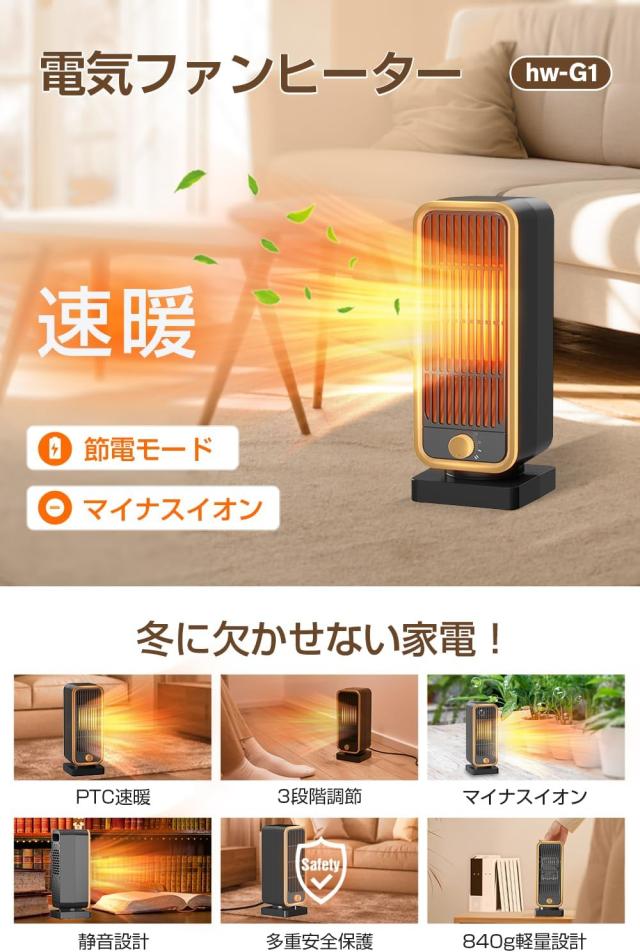 最新版セラミックヒーター ファンヒーター 2秒速暖 足元ヒーター 大風量 電気ファンヒーター 省エネ マイナスイオン空気清浄 3段階温度調節 転倒OFF ミニ
