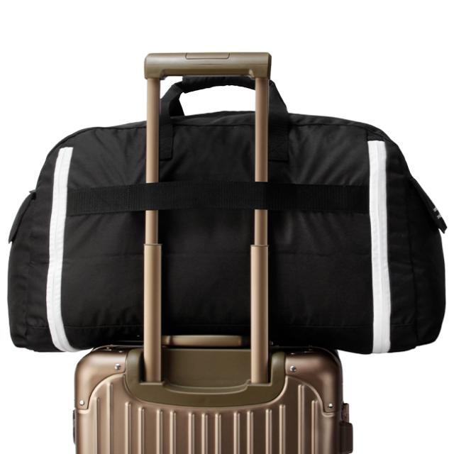 背面側にキャリーバー通しが付属。荷物が重くなったバッグも、キャリーケースに乗せて運べば移動もスムーズに。