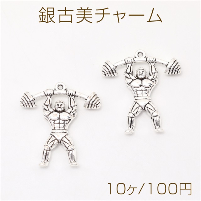 銀古美チャーム アンティークシルバー メタルチャーム スポーツチャーム ウェイトリフティング 重量挙げ カン付き(10ヶ)