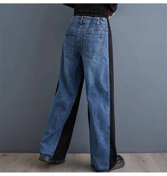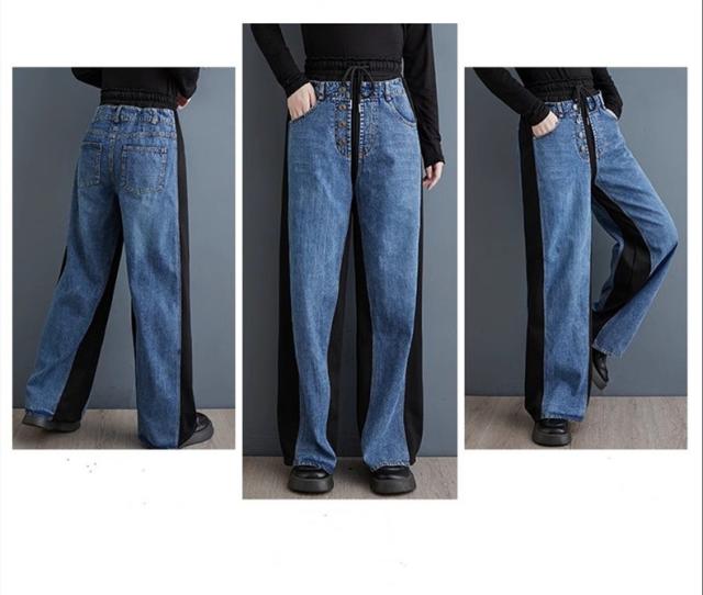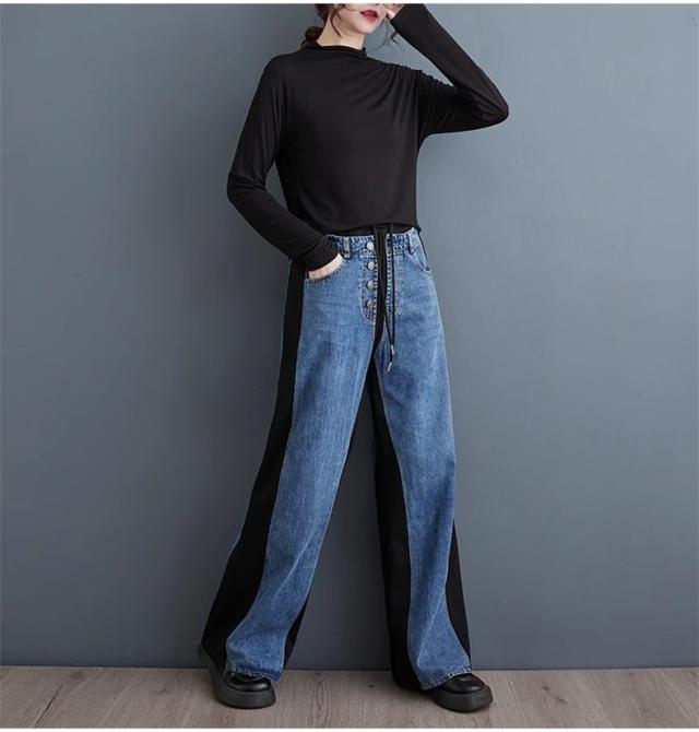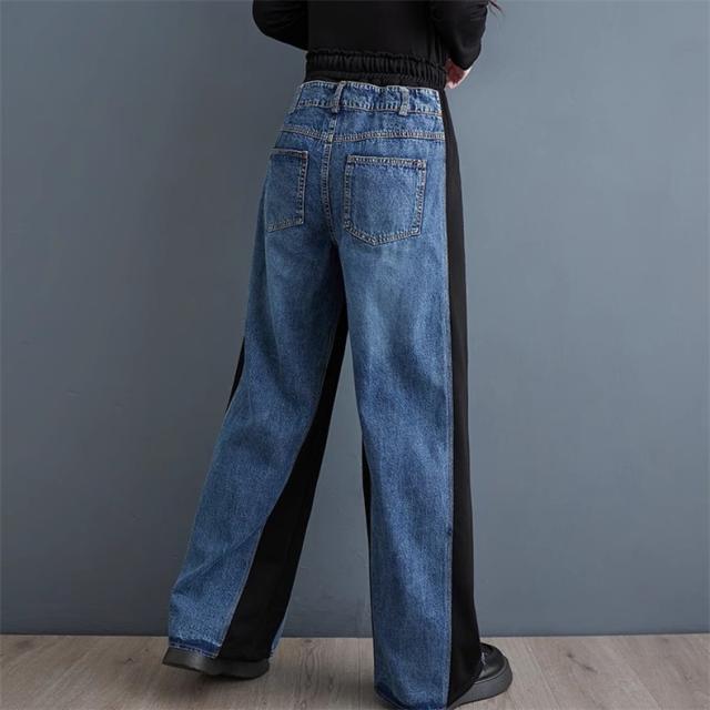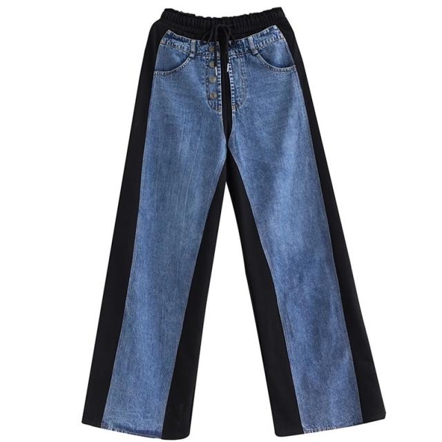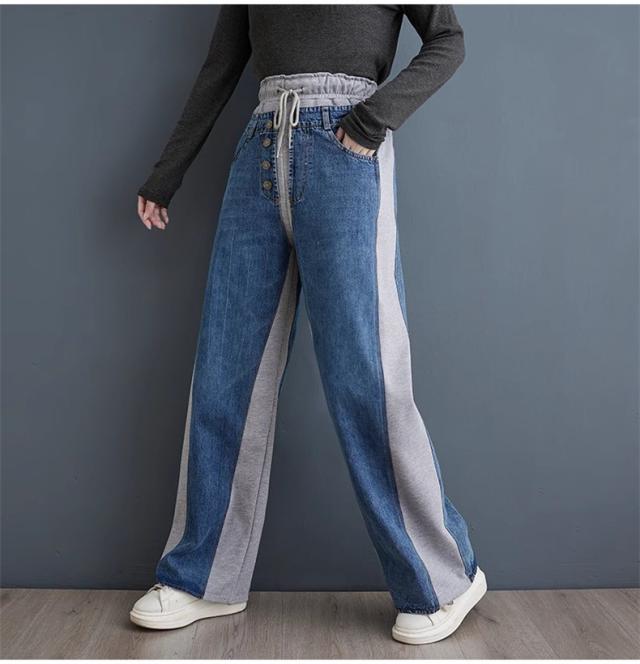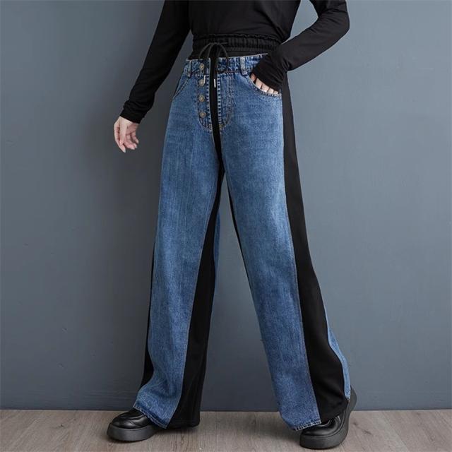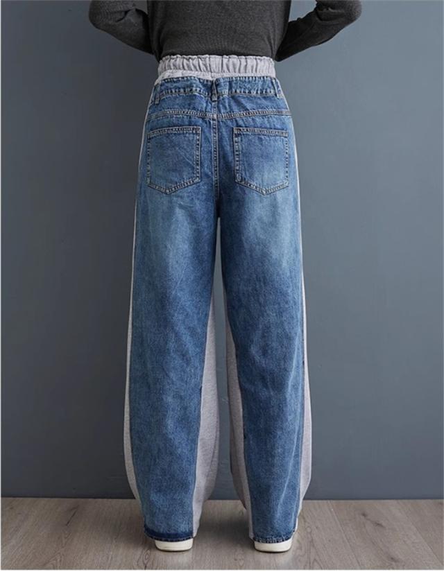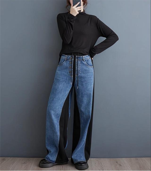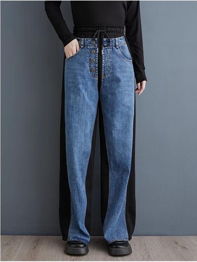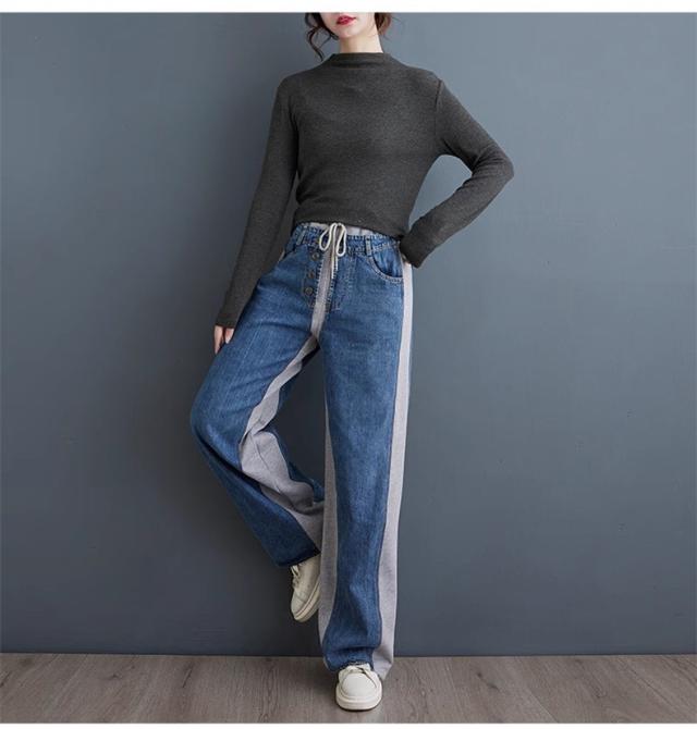 秋冬パンツ レディース 大人ボトムス ズボン ロング丈 イージーパンツ ウエストゴム 綿100% 配色切り替え デニムパンツ カラー配色とトレンド感GOOD