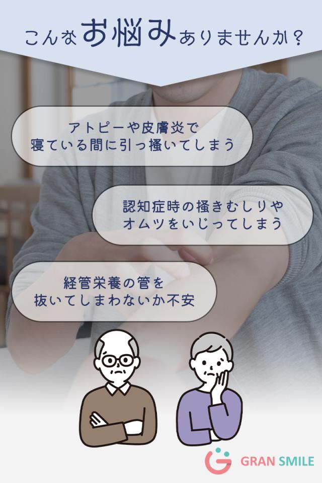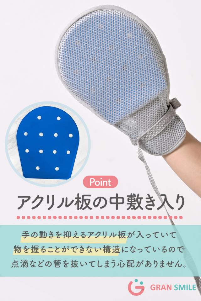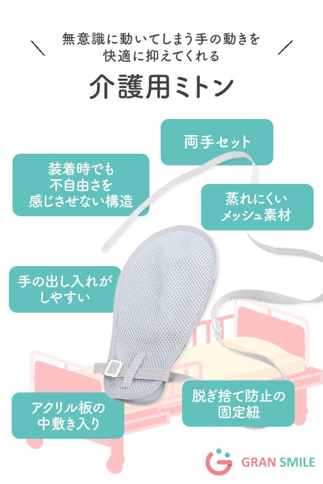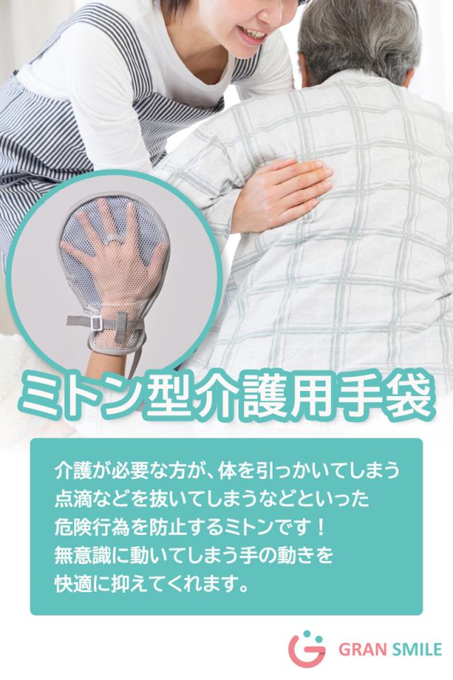 介護が必要な方が、体を引っかいてしまう、点滴などを抜いてしまうなどといった危険行為を防止するミトンです。