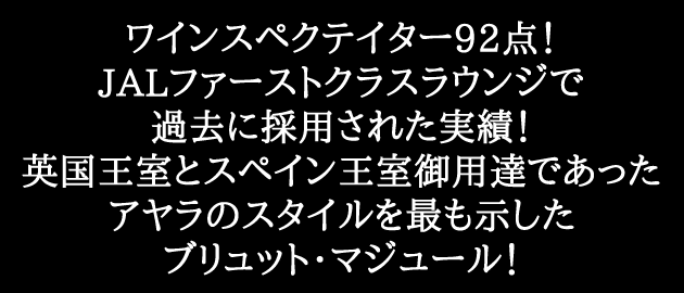 アヤラのスタイルを最も示したブリュット・マジュール。ピノ・ノワール40%、シャルドネ40%、ピノムニエ20%。使用されるピノ・ノワールやシャルドネは全て最良のグラン・クリュやプルミエ・クリュのものを使用。30ヵ月瓶内で熟成を行い、出荷まで4〜6ヵ月を経てリリース。ピノ・ノワールの複雑でエレガントな風味と、シャルドネの爽やかな酸味がバランスよく感じる。フレッシュでレガントなスタイルをパーフェクトに表現された熟成期間と控えめなドサージュ。