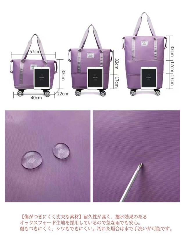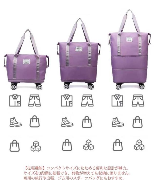 | 【大容量 たっぷり収納ストンバッグ】コンパクトなのに大容量。大きすぎず小さすぎない、ちょうど良いサイズのボストンバッグが登場!メイン収納の他に、防水ポケット、小物を入れるポケットが2つあり、荷物を分けて収納できます。どこに何を収納しているか迷うことがありません。 【取り外し可能な車輪】4つのキャスター付き、キャリケースのように荷物を引いて重さを気にせず持ち運ぶことが可能です。長距離移動もスムーズにできます。簡単に取り外し可能、需要に応じて自由に解体できる、取り回しが良く使いやすいです。 【拡張機能】コンパクトサイズにたためる便利な設計が魅力。サイズを3段階に拡張でき、荷物が増えても収納に困りません。短期の旅行や出張、ジム用のスポーツバッグにもおすすめ。 【スタイルに合わせて使える3wayタイプ】手持ち、肩掛け、キャリーオンバッグとして3wayで使えます。ジムバッグやヨガバッグ、プールバッグ、スポーツバッグ、旅行バッグ、トラベルバッグ、非常用バッグ、お買い物バッグ、斜め掛けバッグに。スポーツ、アウトドア、旅行などの用途から普段使いまで、あらゆる場面でご使用いただけます。 【傷がつきにくく丈夫な素材】耐久性が高く、撥水効果のあるオックスフォード生地を採用しているので急な雨でも安心。傷もつきにくく、シワもできにくい。汚れた場合は水で手洗いが可能です。 | |